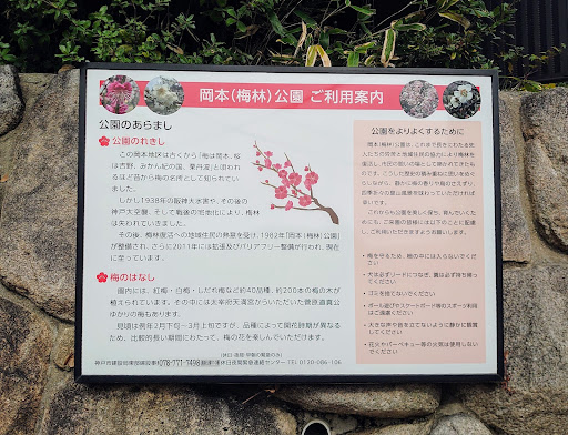 昔から、「梅は岡本、桜は吉野、みかん紀の国、栗丹波」と唄われた岡本梅林の起源は明確でないが、山本梅崖の 『岡本梅林記』に羽柴秀吉の来訪が記されているところよりかなり古くから存在していたようである。 寛政十年(1798)には『摂津名所図会』に岡本梅林の図が登場する程盛んとなった。