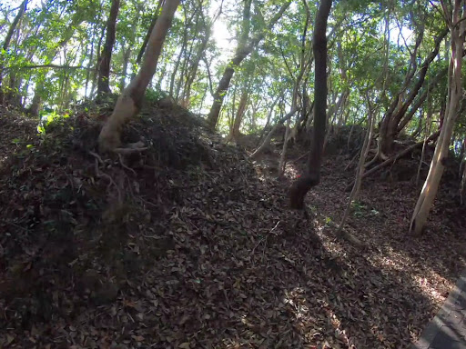 わずかに残ってるうちで最も見るべきものは、長宗我部の城らしい三重堀切でしょうか(道がぶち抜いてしまってますが…)。龍馬記念館の駐車場から、西の林の中へ歩いていくと見えてきます。遺構をぶち抜いて道を作っておきながら「堀切を保護するために、中へ入らずに遊歩道からご覧ください」とあるのがなんとも言えません…まあ、見事な三重堀切の片鱗はうかがえます。