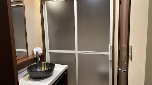 内風呂は露天の石風呂より1~2度位低い温度設定でした。 シャワーで水浴びしつつ、3つの風呂を堪能しました。 露天には休憩用のベンチブランコがあったりします。 脱衣所に戻ると、紙コップホルダーに気が付きました。
