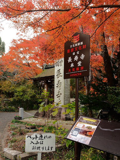 Read more11月下旬に訪れました。 びわ湖の南に位置する、三つの国宝寺院『湖南三山』の1つです。 駐車場(無料)、拝観料(大人:600円) 境内はちょうど『紅葉』が『見事』でした。 参道の至るところに、焼き物などで出来たかわいい『マスコット』が鎮座しており、探したり、写真におさめたり…楽しいです。 建造物・仏像など『国宝』や『重要文化財』がたくさんあり(仏像など『撮影禁止』) 『本堂』の中を拝観致しましたが、かなり歴史のある『荘厳』な内部、ならびに仏像など、知識の乏しい私でも、久々に『圧倒』されました。 帰り際、出口付近で(お寺の方かな?)『本坊(庫裏)に、切り絵が展示されているので、どうぞ…』と、お招き頂いたので拝観させて頂きました。 歴史のある『和』の内装と、ダウンライトな『照明』、窓越しに見える『紅葉』に、施された『切り絵』が、とっても見応えがあり『ステキ』でした(お招き頂いて『ありがとうございました』) 野暮用で、千葉県から『滋賀県』を訪れましたが、せめて1ヶ所だけでも『滋賀県観光を…』と選んだ『長寿寺』は、とても『い...