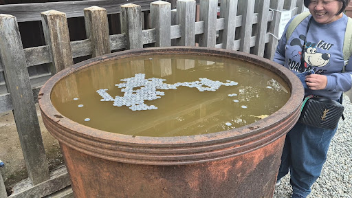 At the main shrine, there are Omikuji (fortune telling paper) and charms available for sale. There's also a pot where people try to make their coin float. I think it means good luck for those who manage to successfully float their coin.