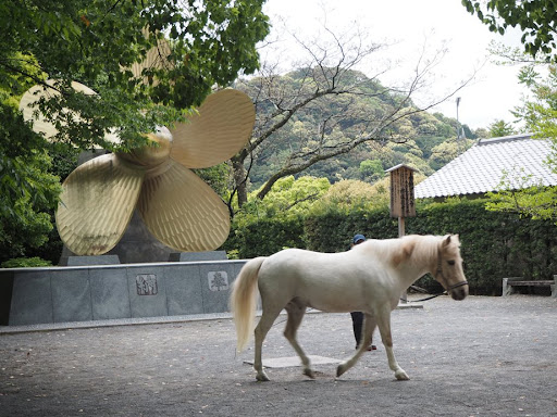 The path you found right after the big gate is called “桜の馬場.(さくらのばば)” ”馬場“ is a place where you practice horse riding, so it means a horse-riding practice area with cherry blossoms. Unfortunately, cherry blossom season had already passed when we visited there. That’s why we missed the beautiful scenery. Hopefully, next time. Hahaha. After 桜の馬場, you will arrive at a Torii gate called 西詰銅鳥居(にしづめどうとりい). Near the gate, there is a place where they keep white horses which are donated as gifts to the god. Luckily, we could see a horse walking.
