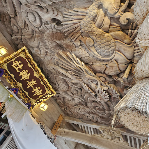 拝殿の天井にある15mを超える龍の彫刻が有名で開運祈願に訪れる参拝者は多い。正面には浦島太郎と乙姫が彫られています。