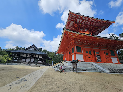 Read more緑の多い壇上伽藍の中で、一際目立つ朱塗りの建物(多宝塔)が「根本大塔」ですが、弘法大師空海が最初に着工した建造物になります。これは、日本初の多宝塔でした。 残念ながら開山である「お大師さんの入定される前までに」完成しませんでした。 よって空海の弟子である真然(空海の甥と伝わる)の代まで、後継され887年頃にやっと完成することができました。 その後、何度か火災で焼失し、再建されましたが、現在の大塔は昭和12年(1937)に建造され。(高さ約48m「尺貫法で1丈八尺の10倍」)、四面はそれぞれ幅30メートルの大きさです。 内部に入る思わず大きな世界に迷い込んだような錯覚に襲われるでしょう!! すべての宇宙の中心である大日如来が此方を見据えておられます。 主尊佛の四方に金剛界の四佛である如来が配置されています。 右前方に東方の阿閦(あしゅく)如来、左前方に、南方の宝生(ほうしょう)如来、左後方に西方の阿弥陀(あみだ)如来,右後方に北方の不空成就(ふくうじょうじゅ)如来が鎮座しており、丸柱には「堂本印象画伯(どうもといんしょうがはく)により描かれた十六菩薩佛が配置されています。 十六菩薩はの配置は、 右手前(東方守護)に金剛薩埀(さった)、金剛王、金剛愛、金剛喜。 左手前(南方守護)に金剛宝、金剛光、金剛幢(とう)、金剛笑。 左後方(西方守護)に金剛法、金剛利、金剛因、金剛語。 右後方(北方守護)に金剛業(ごう)、金剛護、金剛牙(げ)、金剛拳。 を配置。