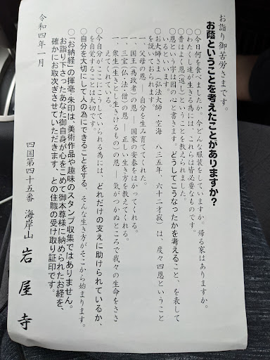 The temple was beautiful, but since I'm foreign I got a pretty passive-aggressive note. It says basically "The calligraphy and stamps on the nokyocho book are not a piece of art or for stamp collecting as a hobby. It signifies that you have put your heart into praying to the main Buddha image." I have lived here for a long time and put my heart and soul into the prayers and am very spiritual in my pilgrimage. Just because I'm foreign does not mean that I'm just a typical tourist. The woman at the nokyosho office didn't even attempt to talk with me about why I'm visiting and just gave me this paper with my stamped nokyocho book. Thankfully this was not a typical experience on my 88 temple pilgrimage. Yes, I went to all 88 temples and prayed at every one. This kind of treatment is not conducive to making foreign people feel welcome in Japan and only reinforces the doubts...