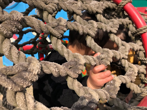 イルカをモチーフにした低年齢向け遊具と、 小学生向け遊具と、クライミングウォールのような遊具がある。これは遊び方によっては子供が多い日は少し危ない。 低めのターザンロープあり。