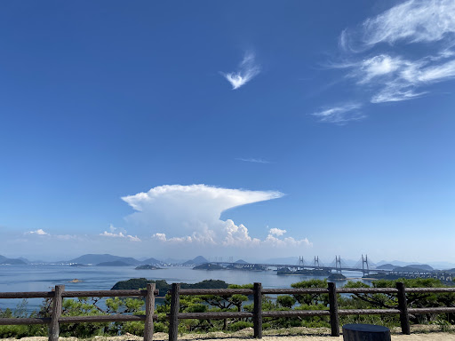 It's a small hiking trail to the summit of a low mountain overlooking the sea. An hourly bus will get you there from a number of locations including Kojima station. The bus goes in a single direction, so the ride to the mountain is longer than the ride back. The walk to the second observation point is short (maybe 5 minutes) and the summit 10 minutes from there. The Japanese gazebo isn't so amazing but it gets you square above the Seto-Ohashi bridge. That point is maybe 5 mins from the summit.