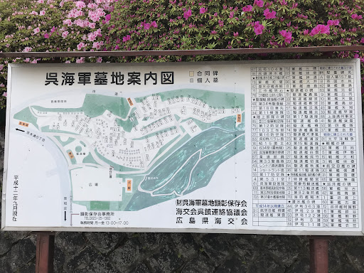 公園となっているが、実際は呉の中心部の外れにある、旧日本軍の艦船搭乗員が合同で祀られている墓地である。 写真にもあるが特に大和の戦死者碑が一番有名で、大和会により墓地の一番目立つ場所に建立されている。 今は定期的に市の職員が清掃に訪れている様で、他の口コミにあった掃除をして欲しいと言う声の心配はしなくても良い。 公園そのものが山の崖に作られているので、頂上まで登ると写真の様な展望がいただける。しかしナビに任せて行くと公園をスルーして裏手にあるとんでもない激坂悪路に連れていかれるので要注意。呉市方面から来た場合にもしもナビが公園近くで左に曲がれと指示したらそこは右に進んで欲しい。 さて、この公園は敷地内に簡単な資料館があり、過去に公園で開かれた慰霊祭の写真を始めとした資料を閲覧する事が出来る。 写真3枚目はここでしか見る事の出来ない、大和生還者の写真で慟哭の海の作者である能村副長が記述していた第1回戦艦大和慰霊祭の様子である。大和生還者は吉田満が一番有名だが、能村副長のお顔を拝する事が出来るのは恐らくこの資料館だけであろう。