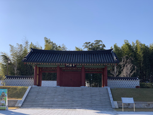 正面有一座漂亮的百濟門 , 與韓國靈巖郡一起合作建造的