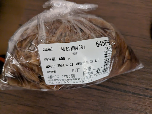 Read more盛岡から久慈方面へ向かう国道途中にあります。大坊峠を登りきったところ。今回は産直でホルモン鍋用のホルモン¥645を購入してみたので、ホルモンのレビューです。若干のニンニク臭はありますが、某支所前ほどでは無いのでそのまま車内に置いても大丈夫。今回はキャベツが高かったので、豆腐ともやしと牛蒡で煮てみました。作り方のメモが入っており、それにも書いてますが基本的にはコップ1~2杯の水で希釈します。野菜の水分を考慮してもかなりしょっぱいので希釈必須。ホルモンのお味の方はというと、肉そのものにかなりしょっぱめに味がついているのですが、ホルモンの新鮮さは感じられず、また何の辛味かは分かりませんが汁が結構辛いです。味としてはかなり単調。それとなぜか鶏むね肉が入っており、これまた味がシミシミで燻製かと思うほどしょっぱい。うーん、某支所前の二匹目のドジョウを狙ったのか分かりませんが、全く相手にならない。それどころかスーパーの冷凍で売っている沼宮内のホルモンとか横◯のホルモンにも遠く及ばず。くずまきワインで漬け込んでるみたいですが、そ...