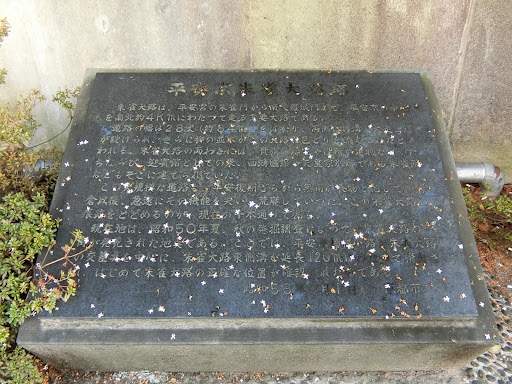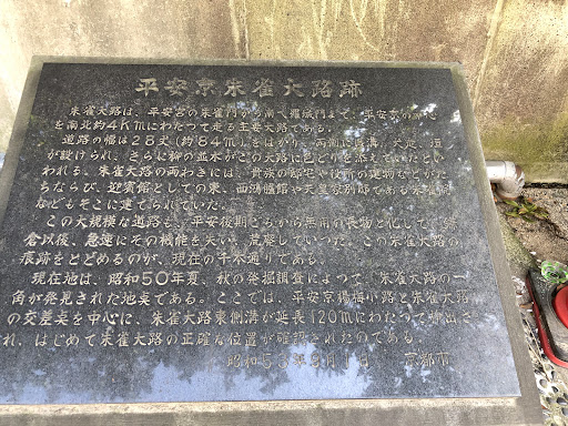 平安京朱雀大路跡銘板: 平安京の朱雀大路は,朱雀門から羅城門まで,南北に4キロメートルにわたって延びる,平安京のメインストリートである。幅は84メートルほどあり,並木として柳が植えられていた。本来,朱雀大路が都の中心とされていたが,右京域の衰退により中心から外れたため,平安時代を通じて徐々に荒廃・縮小していった。加えて,朱雀門以北の内野(旧大内裏)には道が北進していき,鎌倉時代には「千本通」と呼ばれるようになる。 この地は,昭和50年(1975)に発掘調査が行われ,初めて朱雀大路の痕跡が確認された場所である。 建立年 1975年 建立者 京都市 寸 法 高68×幅111×奥行97cm 碑 文 [北] 平安京朱雀大路跡 朱雀大路は、平安京の朱雀門から南へ羅城門まで、平安京の中心を南北約4kmにわたって走る主要大路である。 道路の幅は28丈(約84m)をはかり、両側には溝、犬走、垣が設けられ、さらに柳の並木がこの大路に色どりを添えていたといわれる。朱雀大路の両わきには、貴族の邸宅や役所の建物などがた ちならび、迎賓館としての東、西鴻臚館や天皇家別邸である朱雀院などもそこに建てられていた。 この大規模な道路も、平安後期ごろから無用の長物と化して、鎌倉以後、急速にその機能を失い、荒廃していった。この朱雀大路の痕跡をとどめるのが、現在の千本通りである。 現在地は昭和50年夏、秋の発掘調査によって、朱雀大路の一 角が発見された地点である。ここでは、平安京楊梅小路と朱雀大路の交差点を中心に、朱雀大路東側溝が延長120mにわたって検出され、はじめて朱雀大路の正確な位置が確認されたのである。 昭和53年9月1日 京都市 Heiankyo Suzaku-oji Ruins Nameplate: Suzaku-oji Street in Heian-kyo is the main street of Heian-kyo, stretching 4 kilometers north-south from Suzaku-mon Gate to Rajo-mon Gate. It was about 84 meters wide and was lined with willow trees. Originally, Suzaku-oji Street was considered the center of the capital, but due to the decline of the Ukyo area, it was deviated from the center, and it gradually fell into disrepair and shrinkage throughout the Heian period. In addition, the road went north to the Uchino (former Daidairi) north of Suzakumon, and in the Kamakura period it was called 'Senbon-dori.' This area was excavated in 1975 and was the first place where traces of Suzaku Oji were confirmed. Established 1975 Founder Kyoto City Dimensions height 68 x width 111 x depth 97 cm Inscription [North] Heiankyo Suzaku Oji Ruins Suzaku-oji is the main road that runs approximately 4 km north-south through the center of Heian-kyo, from the Suzaku-mon gate in Heian-kyo to the Rajo-mon gate. It is said that the width of the road was 28 jō (approximately 84m), with ditches, dog runs, and fences on both sides, and a row of willow trees that added color to the road. On both sides of Suzaku Avenue, there were residences of nobles and buildings of government offices. In addition, Higashi and Nishi Korokan, which served as guest houses, and Suzakuin, a villa of the imperial family, were also built there. From around the late Heian period, this large-scale road became useless, and after the Kamakura period, it rapidly lost its function and fell into disrepair. Today's Senbon-dori remains the remains of Suzaku-oji. The current location was found to be part of Suzaku-oji Street during excavation in the summer and autumn of Showa 50 (1975). This is the point where the horn was found. Here, a 120-meter long ditch on the east side of Suzaku-oji Street was detected centering on the intersection of Heiankyo Yangbai-koji and Suzaku-oji Street, and the exact location of Suzaku-oji Street was confirmed for the first time. September 1,...