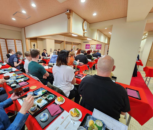 All the different ticket options (tea with a maiko, dinner with a maiko, games with a maiko, etc.) are squeezed into the same space. Some people are eating, others are doing a tea ceremony — it feels completely chaotic. Out of the 37 minutes in total, the first 10 were wasted with the moderator simply asking where each group of 20 guests came from.