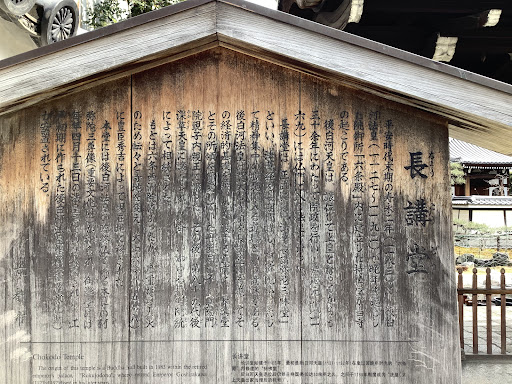 長講堂: もと後白河法皇(ごしらかわほうおう)が仙洞(せんとう)御所に営まれた持仏堂で、正式名を「法華長講弥陀三昧堂(ほっけちょうこうみださんまいどう)」といい、法華経を永遠に讃し、阿弥陀仏を念じて三昧境に入る道場という意味である。寿永2年(1183)、法皇が六條西洞院の平業忠(なりただ)の邸に移られたので、この堂もそこに移建され六条長講堂とよんだ。法皇は多くの所領を寄進したが、これが史上に有名な長講堂領で、法皇の崩後、皇女宣陽門院覲子(きんし)内親王に継がれて以来、いわゆる持明院統によって相続された。 再三の火災のため転々と寺地を変え、天正6年(1578)に現在地に移った。現在、粟生光明寺(あおうこうみょうじ)の所轄する西山浄土宗(せいざんじょうどしゅう)に属する。後白河法皇の臨終仏(りんじゅうぶつ)である本尊阿弥陀如来及両脇侍(りょうわきじ)像と御影堂(みえいどう)に安置する後白河法皇木像はともに重要文化財に指定されている。 (京都観光NAVIより) Chokodo: