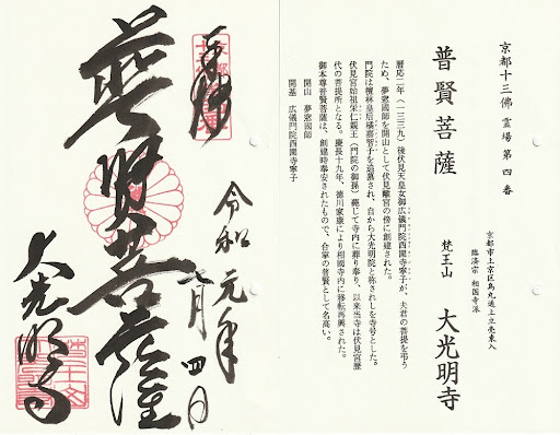 大光明寺は相国寺が建立される以前、暦応二年(1339)に後伏見天皇(1288~1336)の皇后、広義門院西園寺寧子が天皇の菩提を弔うため、伏見離宮の傍らに一寺を建立したのが始まりであり、皇后の法号大光明院を寺号としました。 皇后は玽子内親王、光厳天皇、景仁親王、光明天皇の母として北朝を良く支えられましたが、正平十二年(1357)、六十五歳をもって薨ぜられました。詠まれた歌も多く、「玉葉集」「新千載集」などに載っています。 皇后の孫にあたる伏見宮祖栄仁(よしひと)親王が薨じ、寺内に葬り安置されて以来、伏見宮家歴代の御位牌をまつる菩提寺となっていました。その後一時疲弊し、慶長年間に火災にあうも、元和元年(1615)に徳川家康により相国寺塔頭として再興されました。 明治三十六年(1903)、塔頭の心華院と当時天明の大火で焼失していた大光明寺、及びすでに廃絶していた常徳院の3ヶ寺が合併され、心華院の寺域伽藍を改めて、寺号も大光明寺として再興されます。常徳院の開祖空谷明応禅師木像は当寺に安置されています。また足利9代将軍義尚(常徳院殿贈大相国一品悦山道治大居士)の塔所でもあります。 歴代住職には西笑承兌(相国寺92世)や、明治の禅匠萩野獨園禅師(相国寺126世・特住1世)、近年では大津櫪堂禅師(相国寺130世・特住5世)がおられます。 (出典:相国寺HPより) 京都十三仏霊場の第4番札所の大光明寺では、御本尊の「普賢菩薩」の御朱印が頂けます。 門をくぐると枯山水の「峨眉山の庭」があります。 Daikomyoji is a temple beside the Fushimi Rikyu in 1339, when the emperor Go-Fushimi (1288-1336) and Saionji Neishi of the Hirogimonin mourn the emperor's bodhisattva before the construction of Sokokuji. Was started, and the emperor's law, Daikomyō-in, was named as a temple. Her empress was well supported by the Northern Court as the mother of Emperor Kogon, Emperor Kogon, Emperor Kogon, and Emperor Komyō. I was struck. There are many songs written by her, such as "Tamahashu" and "Shinsenzaishu". It has been a family temple dedicated to the mortuary tablets of the Fushimi-no-miya family since it was buried and enshrined in the temple by the prince Yoshihito Fushimi-no-miya, the grandson of her empress. After that, it was temporarily exhausted, and although it was hit by a fire during the Keicho era, it was revived as the head of the Shokokuji Temple by Ieyasu Tokugawa in the first year of Genna (1615). In 1903, the temple area of Shinkain was merged with Shinkain at the top of the tower, Daikomyoji, which was burned down by the Great Fire of Tenmei at that time, and Jotokuin, which had already been abolished. The temple name will be revived as Daikomyoji. The wooden statue of Meio Zen Master, the founder of Jotokuin, is enshrined in this temple. It is also the tower of Ashikaga Yoshihisa, the 9th Shogun of Ashikaga (a resident of Jotokuin, the great minister of the country, Michiharu Etsuyama). Successive priests include Saisho Shotai (Shokokuji 92nd), Meiji Zen Master Hagino Dokuon Zen Master (Shokokuji 126th, Tokusumi 1st), and in recent years Otsu Saido Zenshi (Shokokuji 130th, Tokusumi 5). The world) is here. (Source: From the Shokokuji website) At Daikomyoji Temple, which is the 4th temple of the 13th Buddha Sacred Ground in Kyoto, you can get the red stamp of "Fugen Bosatsu" of the principal idol. Passing through the gate, you will find the "Gabi Mountain Garden" of...