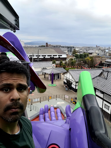 The evangelion part contained a tourist priced (as in inflated) gift shop and this really big (granted really cool looking) mech, Unit 01. You walk inside it, walk up some stairs with some bits of media and sfx from the show playing. Then at the top you get a chance to sit in a "cockpit" which is just a chair with a trigger handle. When you pull the trigger, a cut scene plays and the chair jolts up a little bit. When I say a little, I mean a TINY bit. Then it takes your picture and sends you on your way.