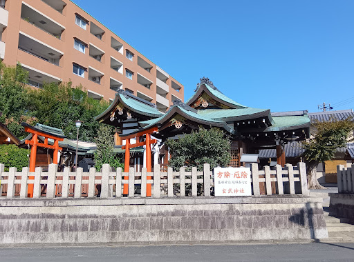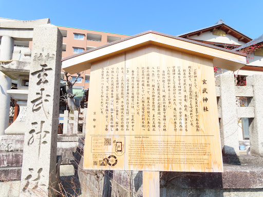 御所の北西に位置し、平安京の北方を守護社、玄武は伝説上の神獣である。亀に蛇が巻き付いた姿、亀は長寿、蛇は商売繁盛。 更に境内には商売繁盛の玄武稲荷と厄除けの三輪明神の末社も有る。