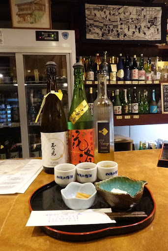 Read moreOur sake journey continued at Ginjo Shubo Aburacho, a liquor store with a small bar where you can sample sake. The staff was knowledgeable and guided us through a tasting of three different sake varieties. The sake labels can be a bit confusing, with two percentages listed—the higher number (e.g., 60%, 40%) refers to how much of the rice grain is polished away, while the lower percentage indicates the alcohol content (15%-18%). I went for the “matured & rich” (umami) palette, while Jasper chose the “light & smooth” and “rich (umami)” options. Everything was served with a delicious side of smoked, root-like vegetables. A must-visit for sake enthusiasts!