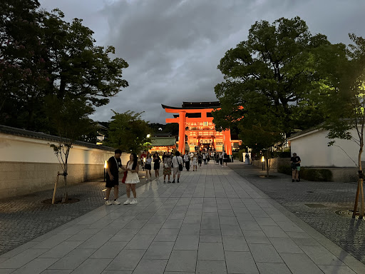 Al cruzar este primer portal, el visitante entra en un amplio patio donde se encuentra el edificio principal del santuario, con sus techos curvados y detalles dorados. Aquí, los fieles rezan por prosperidad, buena fortuna y éxito en los negocios, ya que Inari —la deidad principal del santuario— es el kami del arroz, la fertilidad y la abundancia.