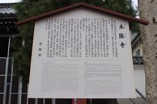 Read more当寺は、慧光無量山本妙興隆寺(略して本隆寺)と称し、日蓮門下京都十六本山の一で、法華宗真門流の総本山です。開山は中山大納言親通卿の子、日真で、後柏原帝より大和尚の称号を下賜されました。長享2年(1488)堂宇を四条大宮に創立しますが、四代日映のとき、天文法乱のため諸堂焼失、1542年、杉若若狭守旧地の現在地に建立しました。十代日遵の時、京都御所の炎上により類焼、明暦3年(1657)名匠坂上作左衛門が再建、以来享保15年(1730)、天明8年(1788)の二度に京都大火は、西陣一帯を焼野原としたが、当寺は、奉祀している鬼子母神の霊験によって焼失をまぬがれ、「不焼寺」として有名であります。境内3300坪に西陣五井の一の名井「千代乃井」及び七代目脩に由来する「夜泣止松」があります。本堂、祖師堂、客殿、三光殿、鐘楼、経蔵、宝蔵、南門、塔頭八ヶ院等の諸堂を有し、宝物には、日蓮上人真筆大曼陀羅、法華玄論、十六羅漢絵像、名器三管、法華経七万字版木等があります。本隆寺は、東は智恵光院通、西は浄福寺通、南は五辻通、北は上立売通に囲まれた大きなお寺です。子供の頃は、恰好の遊び場でした。平成28年から大規模な補修工事が行われています。 「夜泣き止めの松」の伝説です。 信長が天下平定のちょっと前のお話です。 境内本堂わきにある一本の松別名”夜泣止めの松”にまつわる話です。 その当時、本隆寺に日諦上人という偉い坊さんがいました。ある夜、本堂でおつとめをしていると、若い女性が乳児を抱いてけ境内に立っていました。長い黒髪、白いハダの美しい女は、うつむいてしくしくと泣いていました。あくる日も、次の日も同じ事が数日続きました。最初は気にも止めなかった上人も、女のあまりの美しさと涙が気にかかり、ある夜に声をかけた。「どうしたのじゃ、わけを話してくれんかのう。わしで役立つことならば・・・・・・」 「はい、実はわたくし、一週間前に死んだもので御座います。ところがこの子のことが気にかかり、成仏できませんだからこうして夜になるとふびんなわが子を抱いて・・・・」 「うん、そうじゃつたのか。よし、わしがその子を預かって、しんぜよう、仏門に入れて立派な坊ささに育ててつかわす」 「ほんとうに、ほんとうに預かって居ただけるのですね」 女ははじめて笑顔を見せ、また泣いた。そして上人が子供を受け取ると”パッ”と姿を消してしまいました。 その子は寺ですくすくと育ったが、母が居ない為か夜になると、”夜泣き”して上人を困らせた。そのたびに上人は本堂横の松の木の周囲をお題目をとらえて廻った。すると不思議に子供は泣き止んですやすやと眠りについた、という。この子はのちに、日修上人という立派なお坊さんなって寺の繁栄に尽したというお話です。 この伝説から、松の葉を家に持ち帰り子供の枕の下に敷いてやると夜泣きがぴたりとなをる、と言い伝えられ、戦前までは松の木が枯れるかと思うほど手のとどく下のほうは葉が持ち帰られ、庶...
