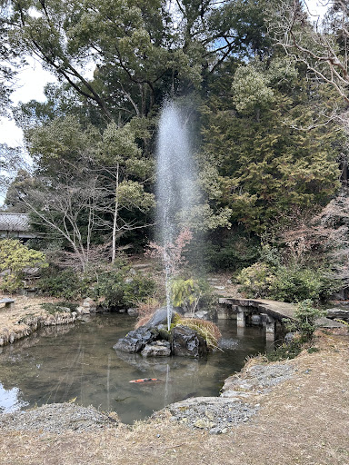 They hold a large festival on 14th and 15th in September. There is a nice pond with a fountain built on the side of a small mountain. In the pricinct : spacious ground space with beautiful landscape surrounded in nature full of green. There is a pond withnatural waterfall as this shrine is a point where the mountainous water flow through. This type of landscape formation is called " shakkei = Borrowed landscape " which makes perfect harmony with surrounding nature. このように周辺の景色とうまく調和する風景を借景と呼びます。