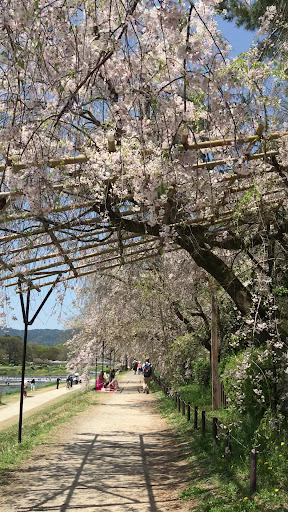 Read moreココ、北大路から北山通りの川東の土堤上に植え込まれた枝垂れ桜の路は、 《半木の道》と呼ばれています。 枝垂れた桜の枝が通行人によって傷まないように、また通行に邪魔にならない用に枝には棚が設けられていて、また風情を醸し出しています。