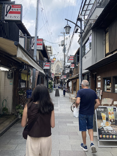 The street is quiet—almost suspiciously so—until a Keihan train barrels past, slicing through like a green flash of industrial thunder. It’s a neighborhood that lets you breathe and sweat in peace. You’ll see: 🔸 A tunnel of bright red torii gates that looks like Fushimi Inari’s cooler cousin 🔸 Rolling steel doors turned into samurai murals (Ryoma would be proud-ish) 🔸 Local shops either bursting with handcrafted personality… or closed since 2003