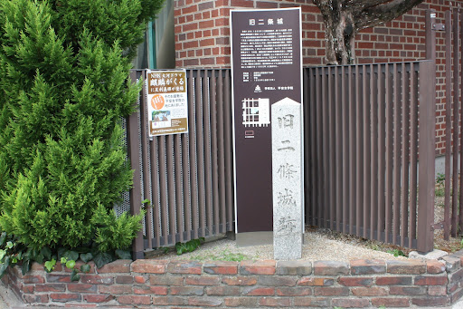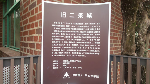 この一帯は1569年(永禄12)織田信長が将軍足利義昭のために造営した二条城(現二条城とは別)の跡である。堀をめぐらせ、高い石垣に櫓を設け、城内も庭園や建物に粋を凝らした堅固で華麗な城郭であった。1573年(天正1)信長により義昭が追放され、城は取り壊された。その後、付近の地下鉄工事で約100体の石仏が発見され、城の石垣に使われたものと判明。この築城を70日で仕上げたこととも思いあわせ、信長の強権ぶりがうかがえる。この石仏は伏見区、安楽寿院と、西京区、京都市洛西竹林公園に保管され、同時に発見された石垣の一部は、京都御苑下立売御門内と、現二条城内に復元されている。現地平安女学院前に石碑がある。 京都市 This area is the site of Nijo Castle (separate from the current Nijo Castle) built by Nobunaga Oda for Shogun Ashikaga Yoshiaki in 1569 (Eiroku 12). Around the moat, a turret was set up on a high stone wall, and the inside of the castle was a solid and splendid castle with elaborate gardens and buildings. Yoshiaki was banished by Nobunaga in 1573 (Tensho 1), and the castle was demolished. After that, about 100 stone Buddhas were discovered in the subway construction nearby, and it turned out that they were used for the stone walls of the castle. Nobunaga's power can be seen in the idea that this castle was completed in 70 days. This stone Buddha is stored in Fushimi Ward, Anrakujuin, Nishikyo Ward, and Rakusai Takebayashi Park in Kyoto City. .. There is a stone monument in front of the local Heian Jogakuin. ...