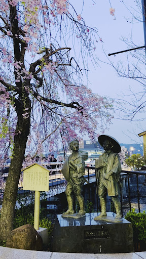 弥次さん喜多さんが泊まった三条大橋に近い宿屋があった場所は、三条大橋を西へ行った北側の「賀茂川館」のあるところです。 At the west side of Sanjo Ohashi is the statue of Mr. Yaji and Mr. Kita. Mr. Yaji, who is known as the main character of "Tokaido Nakagiri Kurige", in the story, there is a funny story that a ladder is bought when staying at an inn near Sanjo Ohashi before going to Osaka on the way to Ise. .. This bronze statue was built in 1994 by Sanjo Kobashi Shotengai, a member of the Nikkakai and a sculptor, Yoshitoshi Koyama, and is the god of travel safety and return fulfillment in Saiin Kasuga Shrine. We had you pray at the return shrine. (Source: Sanjo Kobashi Shopping Street Promotion Association) There are two pieces. ① Prayer for safety along the way Fureai Yaji Kita Travel is on the road, the world is compassionate, wishing for safety along the way It's fun to touch, the beginning of the trip Sanjo Kobashi Shopping Street ② Sanjo Kobashi Shotengai Town We cherish the accumulation of history and culture as the gateway to the capital of Kyoto, and all the people who live, work, and gather in the city join forces to "visit, work, live". Aiming for "Deyoshi's Sanjo Kobashi", we will establish "Sanjo Kobashi Shopping Street Town" here. We will create a city center that values the historical nature of the main entrance to the Tokaido and the neighborhood as an introduction to the city. I, Sanjo Dai "Bridge", Sanjo "Kobashi", create a city center where people, things, and things meet. We will create a city center that is kind to people, kind to the environment, and expresses the breathing of people and things. We will create a city center that colors the comfort of safety and security and the feelings of people walking. We will protect and nurture a beautiful life, a beautiful life, a beautiful town, and the sophistication of a beautiful Kyoto. Foster a city center where you can feel the change of the four seasons by getting close to the pure flow of water. February 2005 Sanjo Kobashi Shopping Street Reconstruction Association