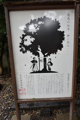 幕末には神社の南に幕府直轄の六角獄舎がありました。 坂本龍馬の恋人おりょうの父、楢崎将作は反幕派の医師であった為安政の大獄で捉えられてこの獄舎に入れられていました。 当時は女性は牢獄へ面会できず、龍馬も幕府からは監視されている身なのでやはり面会できず、二人はこの木に登って様子を窺おうとしたと言われています。 また、龍馬が幕吏に追われる身となったとき、おりょうは龍馬の行方を探している内この神社に寄ったところ、木に「龍」と彫られていていてその筆跡が龍馬のものだったので、京都にいるという伝言だと思い引き続き京都を探して落ち合うことができたという話があるそうです。