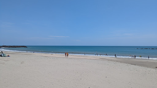 当方40歳の私が小さい頃からほぼ毎年行っている海水浴場です。遠浅で白い砂浜の美しいビーチです。 この辺りは静波が有名ですが良い意味でこちらはこじんまりとゆったりしており比較的空いてます。駐車場も近年は満車ってことはあまりないかと思います。料金は1日600円で安いほうだと思います。夕方になると無料になるのでその時間から来る人もいました。 波は強めな時があるので注意ですがシーズン中はライフセーバーの方々が念入りに見廻りしてくださるので安心です。特にここのライフセーバーさんは毎年精鋭揃いな気がしています。小さい頃から何度もお世話になっており(すみません…)信頼度が半端ないです。 私が行った時は警察の方も見廻りをされていました。 海に入って数メートルのところは貝殻ゾーンで痛いのでマリンシューズで泳ぐと快適です。 普通のビーサンやクロックスは脱げるのでしっかり履けるマリンシューズをオススメします。 波が高いときは無理のない範囲でボードで波乗りも楽しいです。