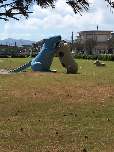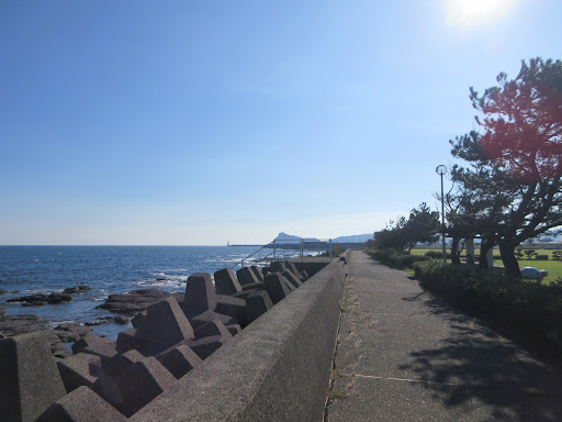 I took a day train trip (Aug 30, 2018) from Kagoshima to the 'end of the line'. Absolutely love the city here. The park is grassy and wide, right on the ocean with an incredible view as a background. Questionable slide design...There are stairs down into the tide pool (could use an off limits year to refresh...) and a kiddo pool on the far side to keep them cool. The strand of sidewalk is long enough that you'll need to take a couple beers with you but plan ahead because the closest convenience store is a bit of a...