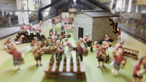 明治蔵はその名の通り、明治時代から焼酎づくりを行っている焼酎工場。 当時の焼酎づくりの様子をミニチュア人形で説明してくれます。 よく見ると米蒸しや種まぜなど、杜氏に関する工程には男性の人形しかいなく、 さつまいもの収穫や選別には女性の人形が配置されています。 今は違うけど酒蔵は女人禁制。細かい描写が表現されていました。