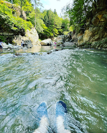 A natural park in a picturesque valley with a stream flowing over rocks and boulders. A beautiful path winds about 20 meters above the water giving a magnificent view.