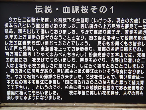 血脈桜 🌸⇒樹齢300年以上、松前を代表する桜の品種南殿の親木 📖血脈桜伝説 昔々、松前の城下に柳本伝八という鍛冶屋さんがおった。ある年春、娘静枝と一緒上方見物に旅立つ。江戸で遊び、お伊勢さんに詣り、京都・奈良を巡って桜花爛漫の吉野に辿り着いた。桜の美しさに魅せられた伝八親子は、しばらくこの地に宿ることにした。宿の近くには尼寺があり、親子は尼さんと親しくなり楽しい日々を過ごした。いよいよ、松前に帰ることになった別れの日、尼さんは静枝の手に一本の桜の苗木を握らせ「故郷に帰られた後は、この桜を私と思ってくださるよう‥」と伝えました。//帰郷後に伝八親子は菩提寺の光善寺の庭にその桜を植えた。やがて桜は見事な花を咲かせるようになり、人々を喜ばせた。そして、幾十年の月日が流れた春、見事に咲き乱れる桜の花を見ながら静枝は、その生涯を終えた。//月日は流れある年、光善寺の本堂を立て直すことになり、桜が伐採されることになった。明日は伐採という日の前夜、光善寺18世穏誉上人の枕元に美しい女性が現れ「私は死ぬ身です。どうか血脈(血脈とは極楽浄土へ行く証文)を与えてくださいますよう‥」と頼むのだった。上人は娘の熱心な願いにほだされ、血脈を与えた。//翌日の朝、上人が桜を見上げたとき何か白いものが風に動いているのを見つた。それは昨夜与えた血脈だった。上人は「さては昨晩の娘さんは、この木の精であったか」と悟り、桜伐採を取り止め、盛大な供養が行われた。そして今もなお、昔と変わることなく爛漫と咲き誇っている。上人の枕辺に現れた桜の精は静枝であったのでは?と、語り伝えられている