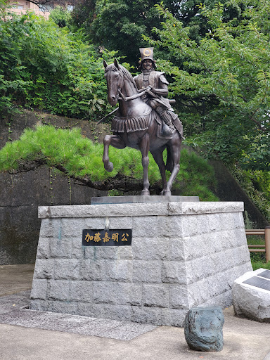 The First Lord of Matsuyama Castle The Equestrian Statue of Kato Yoshiaki Timeline of Kato Yoshiaki (1563-1631) 1563 (Eiroku 6) – Yoshiaki was born in Mikawa no Kuni (the present day Aichi) 1575 (Tensho 3) - Hashiba Hideyoshi discovered Yoshiaki's talent. Yoshiaki became a page to Hashiba Hidekatsu, and named himself Kato. 1583 (Tensho 11)-At the battle between Hideyoshi and Shibata Katsuie, Yoshiaki made an extraordinary contribution as one of the seven excellent commanders "Shichi-hon-yari(seven lancers) of Shizugatake", and was awarded 3,000 koku parcels or about 540,000 liter of rice. Yoshiaki continuously served Hideyoshi diligently as a director retainer. 1595 (Bunroku 4) - Yoshiaki's territory was changed to lyo Masaki with 60,000 koku parcels or 10.8 million liter of rice. After Hideyoshi's death Yoshiaki served Tokugawa leyasu and fought so well at the Battle of Sekigahara, and awarded Iyo Province with 200,000 koku parcels or 36 million liter of rice in 1601(Keicho 6). 1602 (Keicho 7) - Yoshiaki started construction of Matsuyama Castle, and moved his residence to Matsuyama from Masaki in 1603. As a lord of Masaki Castle for 6 years and Matsuyama Castle for 26 years, Yoshiaki took initiatives for the development of rice fields by improving the irrigation system from Shigenobu River and Ishite River, which contributed to the stable livelihood of people of the domain.. 1627 (Kanei 4) - Yoshiaki was transferred to Aizu (the present day northern part of Japan such as Aomori and Iwate) and was granted a 400,000 koku parcels or 72 million liter of rice when he was 65 years old. 1631 (Kanei 8) - Yoshiaki died at the age of 69 in the residence of Aizu domain in Edo Sakurada (the present day around Kasumigaseki, Tokyo) on...