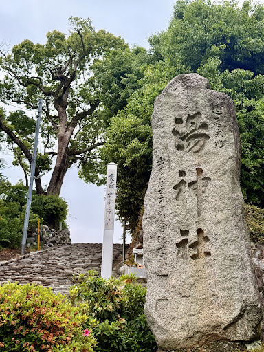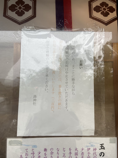 這間湯神社,相傳是第十二代景行天皇下令興建,供奉大國主命與少彥名命。相傳當年少彥名命受傷,大國主命用道後溫泉水。治好了他,因為傳說,讓湯神社成為道後溫泉的能量景點。相傳在1707年的寶永大地震後,關西、四國受災嚴重,上千年的道後溫泉突然不湧泉,當地人心急如焚,在虔誠祭祀與祈禱下,才奇蹟般的再度湧泉,每年的三月,還會盛大舉辦湯祭。湯神社除了被視為溫泉守護神,也被視為結良緣、除厄、及商業繁榮的神社。