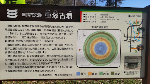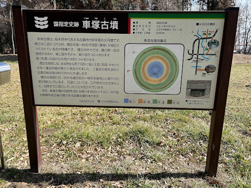 Read more特に駐車場とかは無いですが、道端にスペースが有るので、問題無いと思います。 立て看板の脇には、親切に説明資料が入ったポストが有って、一部もらいました。 車塚古墳と脇の牛塚古墳の発掘調査の内容がまとめられていました。 車塚古墳は直径が84mの三段に造られた円墳です。 高さが約11mとの事ですが、てっぺんに登るにはかなり急斜面の場所も有り、多少苦労します。 しかし、古墳は全体的に良く昔の状態が保たれているようで、それも古墳時代以降、何らかの宗教的施設として...