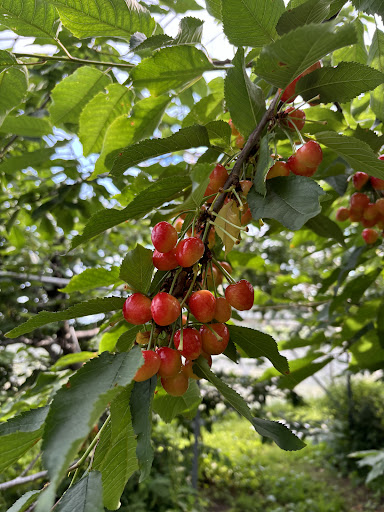 Lovely cherry orchard in Minami Alps. It costs about 2200¥ for 45 minutes of fruit picking, and you can eat all that you pick. There are a variety of cherries, all delicious, with ladders that you can use to climb to the top of the trees where the sweeter fruits are.
