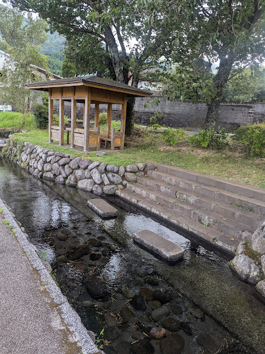 多量の湧水は社を出ると2方向に分かれます。道路沿いの水路に沿って100mほど歩くと、水遊びができるようなところがあり、お気に入りです。水に足首まで浸かってはしゃぎます。いい加減いい歳の大人がwww 階段に腰かけて風にあたるのも気持ちいい🎵