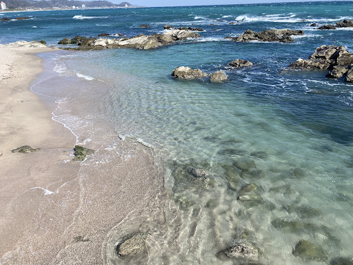 全体的に岩がありまして、遊泳区域内の海底にもごつごつした岩が多数あるので、海中を歩く、泳ぐ際にはマリンシューズなどを履いた方がいいです👟