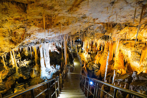 畑のすぐ脇にある入口を入って坂を歩いて下りていくともう一枚ガラスの扉があり、それを開けて入ると鍾乳洞が広がっています。