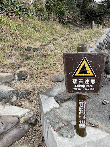逢ヶ浜の端にある、落石注意の看板横の階段から遊歩道が始まる。 途中、土を盛りコースを修繕した形跡もあり、 日々メンテされている様子がうかがえる。