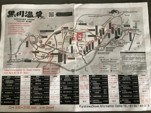 I purchased the “tegata” or Onsen Hopping Pass for ¥1,500. An outstanding concept. It came with a detailed brochure about all the onsen in town, and then a day-specific guide (see pic) to what onsen were open and what were closed and what had limited hours. So very jolly organised!