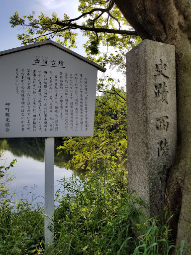 草木が繁っていて、外周に沿って歩くことはできませんでした。史跡西陵古墳と書かれた碑と説明が書かれた看板の所から古墳の方に歩くと、中に入る(古墳に上陸する)ことができました。