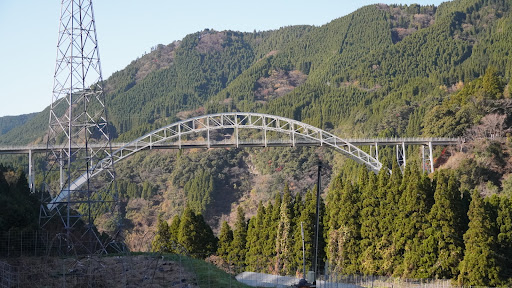 壇ノ浦の合戦に敗れた平家の落人が隠れ住み、小松内大臣平重盛を祭ったと伝えられる、渓谷一帯が見渡せます。 砥用町から椎葉村へ通じる、狭い!林道に架かる鋼アーチ形式の橋です。水面からの高さ86m。