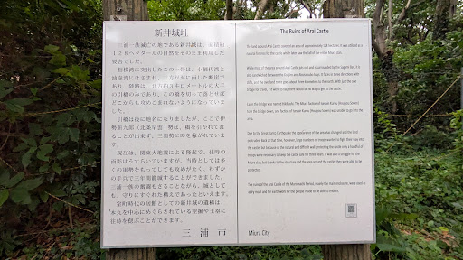 Read more室町時代後期の関東の覇者、扇谷上杉家の家臣、三浦氏の城です。三浦市は相模や三浦半島に勢力をはった大名で、主要な城は、岡崎城(伊勢原市)、住吉城(鎌倉市)、などの城があります。新井城もその一つです。戦国時代初期、足利氏(室町幕府)家臣で、今川氏の客将・北条早雲(伊勢宗瑞・初名、盛時または長氏)に攻められ、岡崎城、住吉城を落とされ、三浦氏当主・三浦道寸(義同)、義意父子はここ・新井城に立て籠もりました。しかし敗北。道寸、義意は討たれてしまい、三浦氏は滅亡しました。その時に血が油のように流れたことから油壺という地名ができたとか…なんとも生々しい…………… 現在は一部が東大の研究所になってるので少ししか見ることができませんが空掘や土塁が残っています。また、地形的に見ると、新井城は海に突き出た小さい半島に位置し、絶壁に囲まれているので難攻不落の城といえます。また、油壺マリンパークの横に...