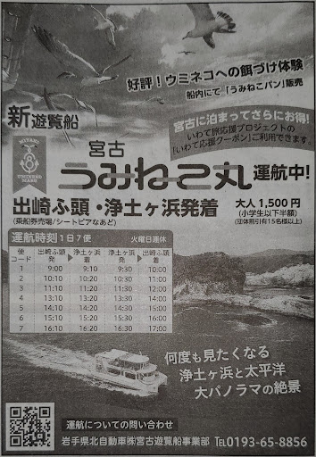 Read more宮古市の海に面した場所にある道の駅になります。近くには、魚市場があり、朝早ければ、活気溢れる場面や新鮮な魚を見る事もできるかも⁉️☝️ 昔は、タラソテラピーという、海水を使った温浴効果がある、運動施設が併設されていたのですが、津波によって破壊されました。 その施設は今はありませんが、新生道の駅として復活してくれました。 中は、産直とお土産コーナーに分かれていまして、産直はその名の通り、新鮮な野菜や果物がズラリと並んでいまして、午後になると品薄もしくは、売り切れとなっている人気ぶりです。お値段も安いので…💦 お土産コーナーは、宮古の塩などを使ったお菓子や、記念に残る物など、多数あります。 その奥に行くと、地物の新鮮な刺身や加工された海産物があり、とても美味しそうです‼️ 花なども売っていますので、お盆や正月準備に訪れた買い物客が、けっこう来まして混み合う事もあるようです❗️ 2階は催事場として貸し出すような場所や、レストランがあります。潮騒(しおさい)って名前だったかな❓️ 昔よりはメニューも増えて、子供達も喜ぶような物もありますが、やはり海鮮系が売りみたいですよ❗️ 確かにウマイって思いましたから、味はグッドと思います👍 外には、ソフトクリームなども売っている場所があり、私としては、そのソフトがかなりの美味しさでして…🍦 道の駅前の道路を奥まで行くと、最近就航した遊覧船「うみねこ丸」が、観光客をお出迎えしてくれてましたね🚢 そのチケットは、道の駅で購入するようです。 近くには、公園という感じはしませんが、高台に作られた公園があり、潮風を気持ち良く浴びる事ができます。 宮古の観光スポットの一つですので、...