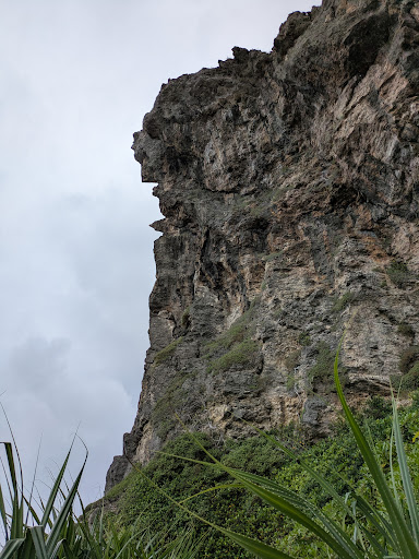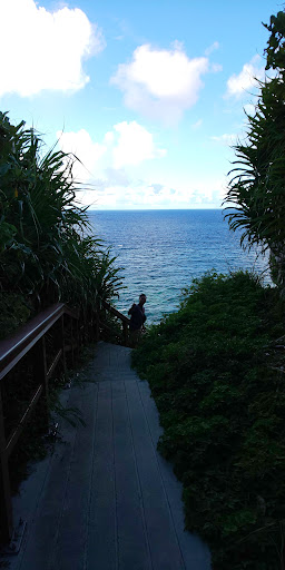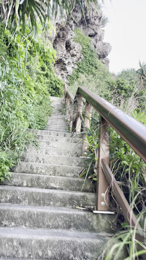 Read more山や川の無い、雨の少ない宮古島の水源は地下にあり地下ダムに貯蔵されます。地形に恵まれて島尻層群泥岩と水を通す琉球石灰岩のおかげで蒸発することなく地下水が豊富。サトウキビ畑等への水やりもここの水源を利用しているそうです。 ムイガーは北西から南東へ断層の崖からなる地下水の川が溜まる場所です。 看板には毎秒22リットル噴出と豊富なのが海へ流れ込む様子で目で見てわかります。 ムイガー景勝地の看板から車で下へ降りるとピンクの東屋の前に駐車場があり、そこから下へ降りる階段が188段。 アダンのトゲトゲ葉っぱを避けながら舗装された階段を下るとムイガーが現れました。90m...