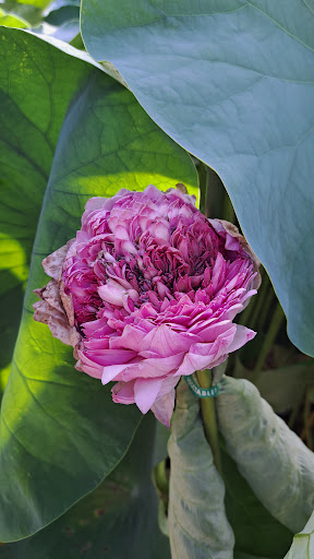 通常の蓮(常蓮:じょうれん)は朝に咲いて午後になるとつぼむを繰り返し、4日ほどで花が落ちますが、 こちらで見られる「近江妙蓮」(おうみみょうれん)は突然変異で出来た種で、花びらの数が5,000〜8,000にもなり、つぼまず、外側の花びらを散らしながら2〜3週間咲き続けると言う変わった蓮です。