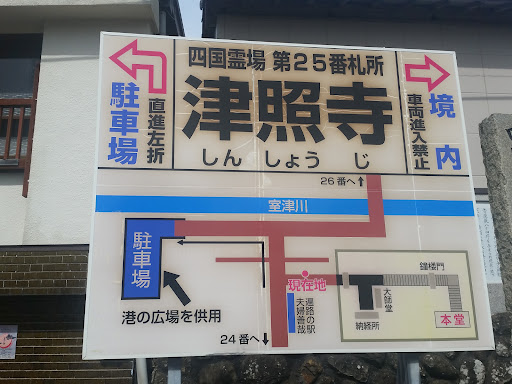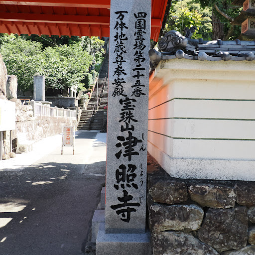 Read more四国八十八ヵ所霊場の参拝でお伺いしました。 真言宗豊山派のお寺で宝珠山真言院津照寺(しんしょうじ)といい、霊場第二十五番札所になります、室戸三山の一つで地元では「津寺」の愛称で親しまれています。 御本尊は地蔵菩薩で別称を「楫取地蔵:かじとりじぞう」といいます。 本堂は参道正面の小高い山の上に鎮座しています階段の途中に竜宮城を思わせるような変わった造りの鐘楼門兼仁王門があります、本堂の正面には太平洋が広がります。 弘法大師空海が四国行脚の砌に山が地蔵菩薩の持つ宝珠に似ていることから霊地として自ら地蔵菩薩を刻み御本尊とし宝珠山真言院津照寺と号されました。 津照寺は当初長宗我部氏の庇護を請けたお寺で、その後土佐藩主の山内氏が国主として庇護(寺紋も山内氏と同じ三つ柏)一町五反の田地を寄付され寺院の運営も全て藩営とされ中老格をもって遇されて隆盛を極めた。 明治の廃仏毀釈で寺領を一旦政府に亦は小作農民に払い下げとなり寺は廃寺となったが、荒廃にまかすこと約十数年の明治十六年に寺名復興が許されたものの寺領は大幅に削られてしまって現存にいたる。 御本尊の延命地蔵の「楫取地蔵」という名の由来は、慶長七年(1602年)の秋に山内家初代の山内一豊公が室戸の沖で暴風雨に遭い困難にあわれたときに、何処からともなく大僧が現れ船の楫を取って御船は無事に室津の港に入港する事ができたという がその後姿が見えなくなったため津寺に参詣してみると、御本尊地蔵菩薩の御体が濡れており大僧が御本尊の地蔵菩薩であった事が分かった之より御本尊が楫取地蔵として伝え...